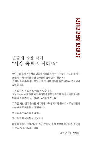 미술협회가 운영하는 웹페이지에 포함된 링크 또는 배너를 클릭하여 다른 사이트 또는 웹페이지로 옮겨갈 경우 개인정보보호방침은 그 사이트 운영기관이 게시한 방침이 적용됨으로 새로 방문한 사이트의 방침을 확인하시기 바랍니다.