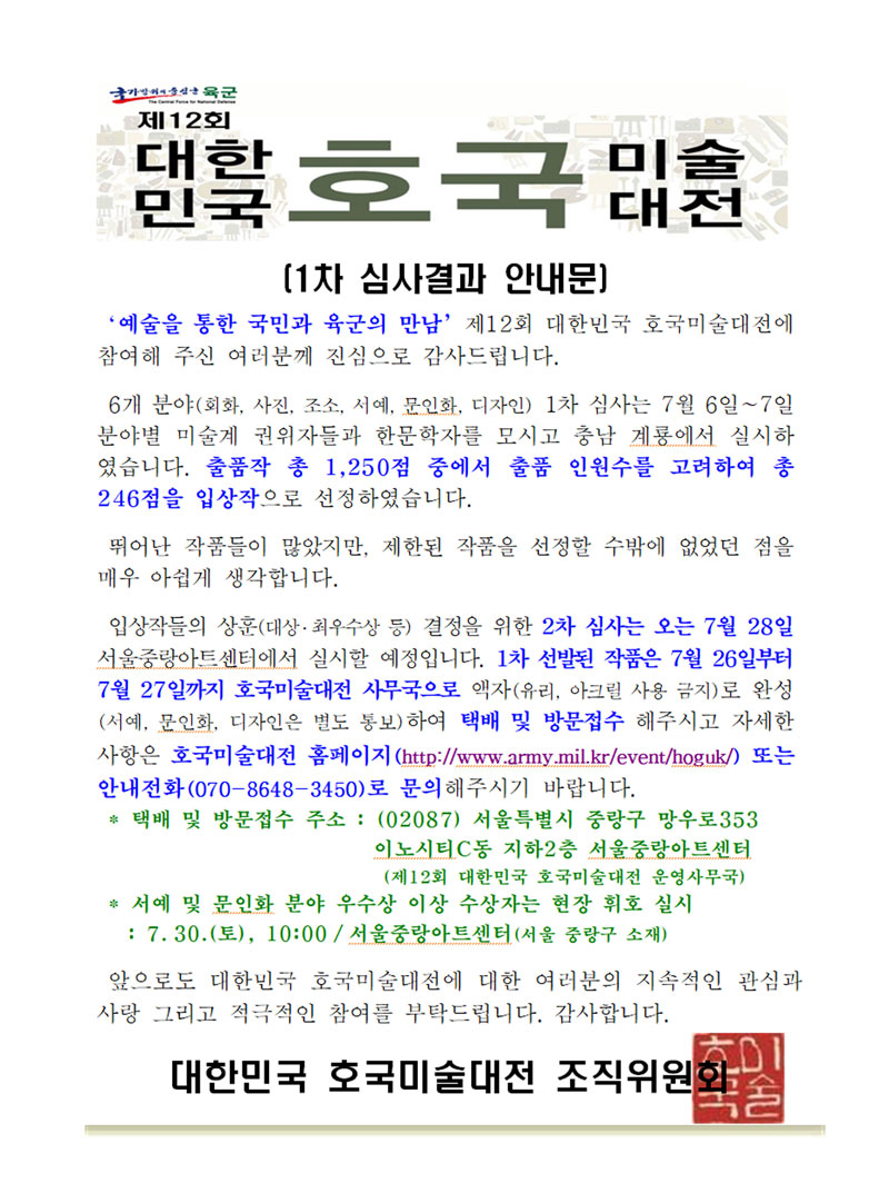 육군본부-호국미술대전 1차 심사결과 및 2차 심사안내 (수상자 명단 첨부파일 참고)