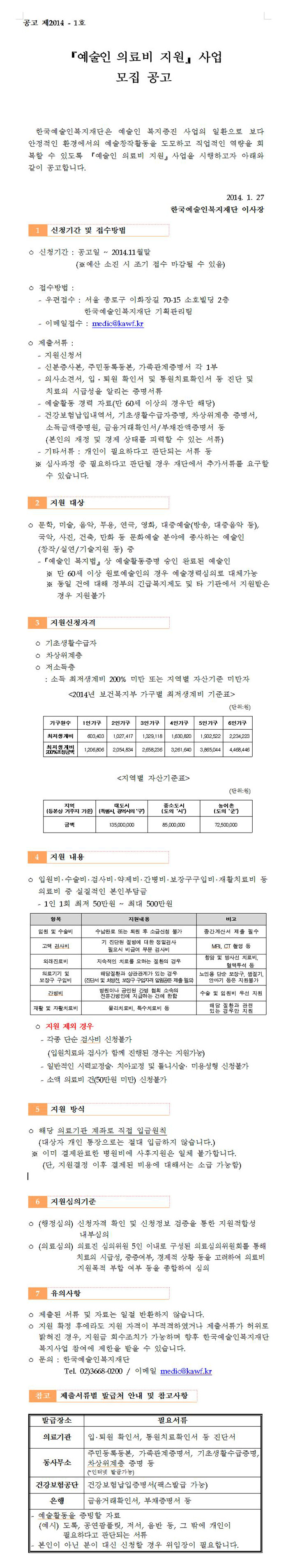 2014 한국예술인복지재단 예술인 의료비 지원사업 안내