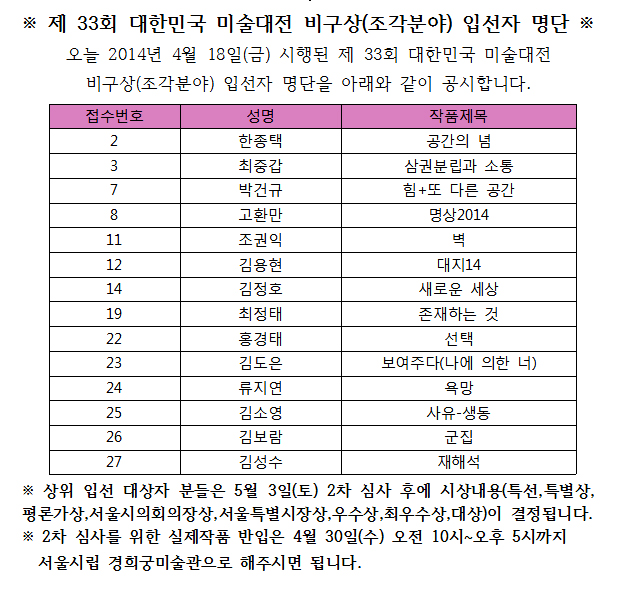 미술협회가 운영하는 웹사이트에서 이메일 주소 등 식별할 수 있는 개인정보를 취득하면 안됩니다.. 만약 기타 부정한 방법으로 이러한 개인정보를 열람 또는 제공받은 자는 [공공기관의개인정보보호에관한법률] 제23조의 규정에 의하여 처벌을 받을 수 있습니다.
