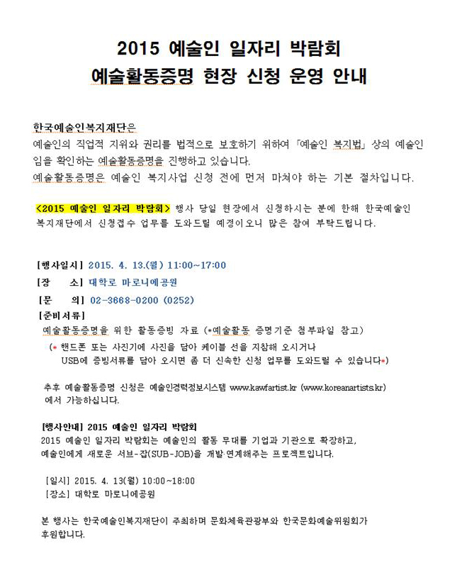 [한국예술인복지재단] 2015 예술인일자리박람회 (4/13 대학로마로니에공원)