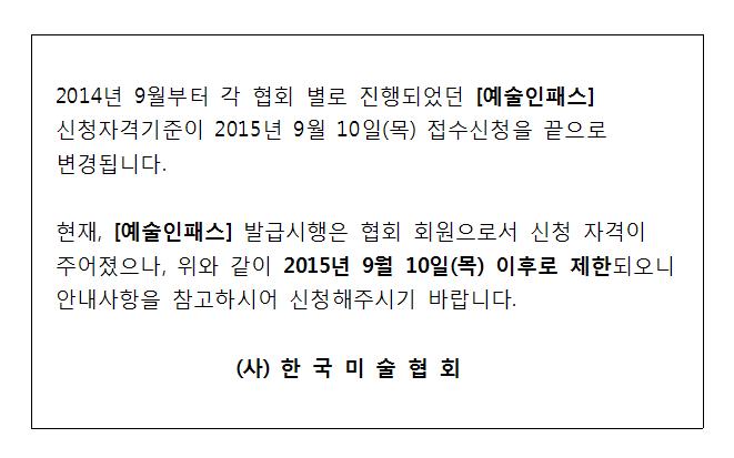 미술협회가 운영하는 웹페이지에 포함된 링크 또는 배너를 클릭하여 다른 사이트 또는 웹페이지로 옮겨갈 경우 개인정보보호방침은 그 사이트 운영기관이 게시한 방침이 적용됨으로 새로 방문한 사이트의 방침을 확인하시기 바랍니다.