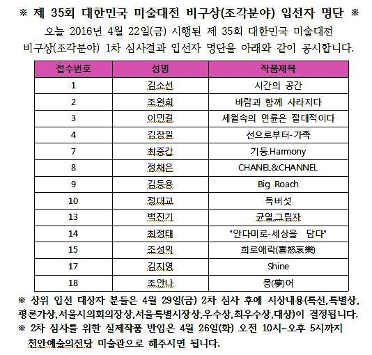 제35회 대한민국미술대전 비구상(조각)부문 입상자 공고