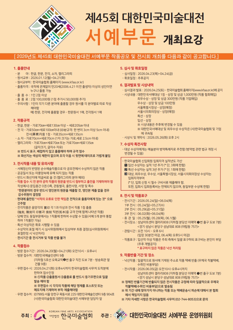 제45회 대한민국미술대전 <서예부문> 개최공고