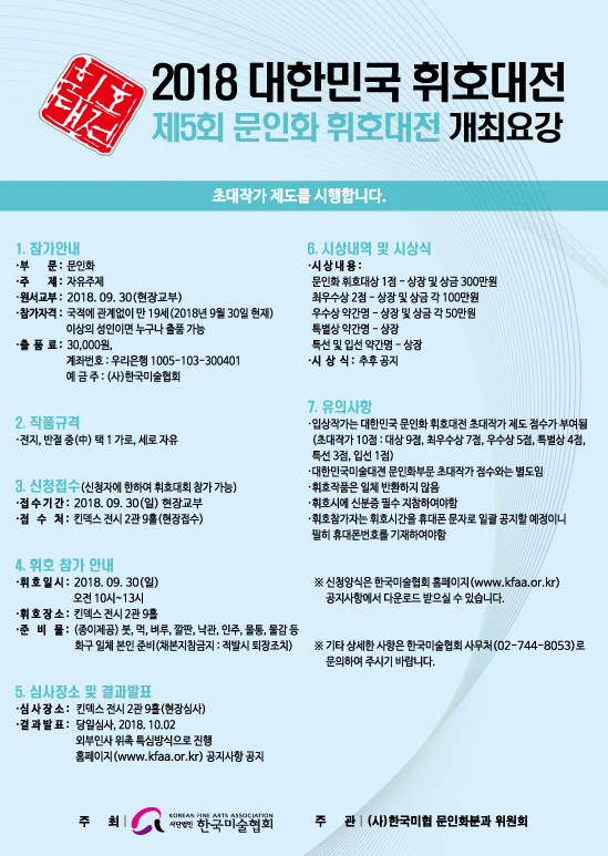 2018 대한민국 휘호대전-제5회 문인화 휘호대전을 개최하오니 회원님들의 많은 관심과 참여를