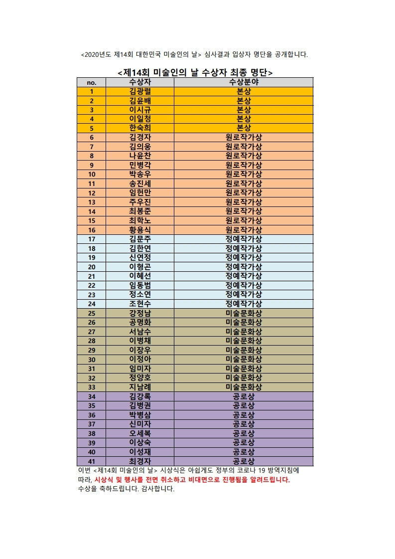 *2020년도 제14회 대한민국 미술인의 날 수상자 명단 업로드가 공지사항에서 누락되어 재업로드합니다.