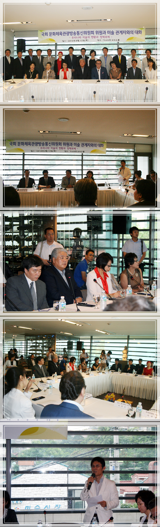 2010년 8월 12일(목요일) 이범헌 상임이사님의 사회로 정병국국회문화체육관광방송통신위원회 위원장, 한선교국회의원, 나경원국회의원과 차대영 이사장, 이두식전이사장, 이광수부이사장을 비롯한 미술계 주요인사들과 함께 우리나라 미술계의 현황과 정책과제에 관하여 간담회를 가졌다. 오후 3시에 시작한 토론이 약4시간 정도 소요한바 열띤 토론을 벌였다.