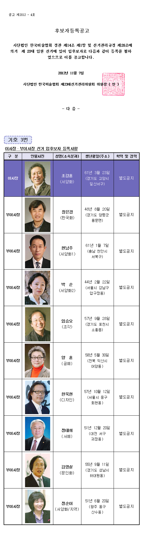 단 정회원의 경우에는 미술협회 데이터베이스와 연동되어 별도로 회원가입을 하지 않고 회원번호를 이용하여 접속 할 수 있습니다.