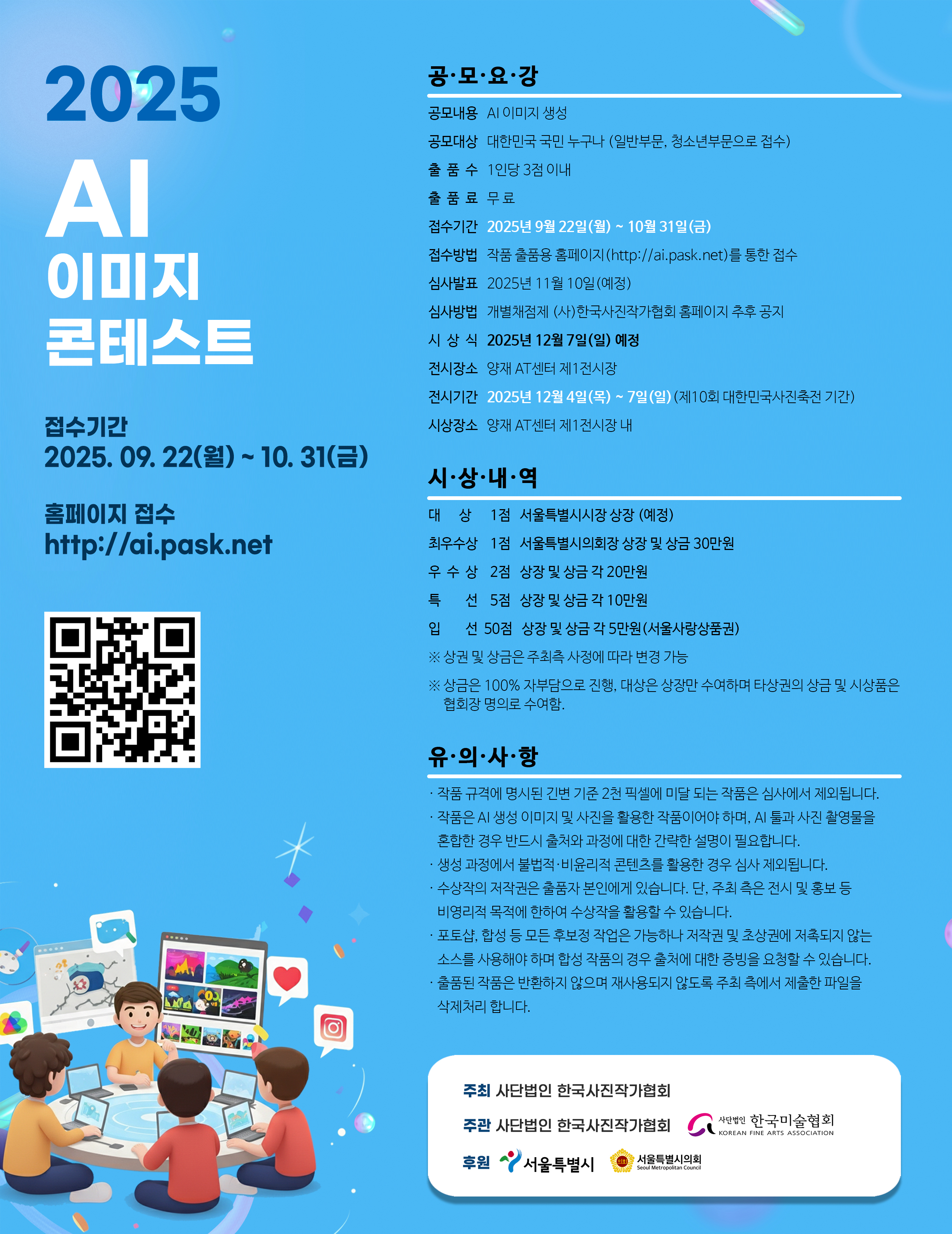 • 작품은 AI 생성 이미지 및 사진을 활용한 작품이어야 하며, AI 툴과 사진 촬영물을 혼합한 경우 반드시 출처와 과정에 대한 간략한 설명이 필요합니다.