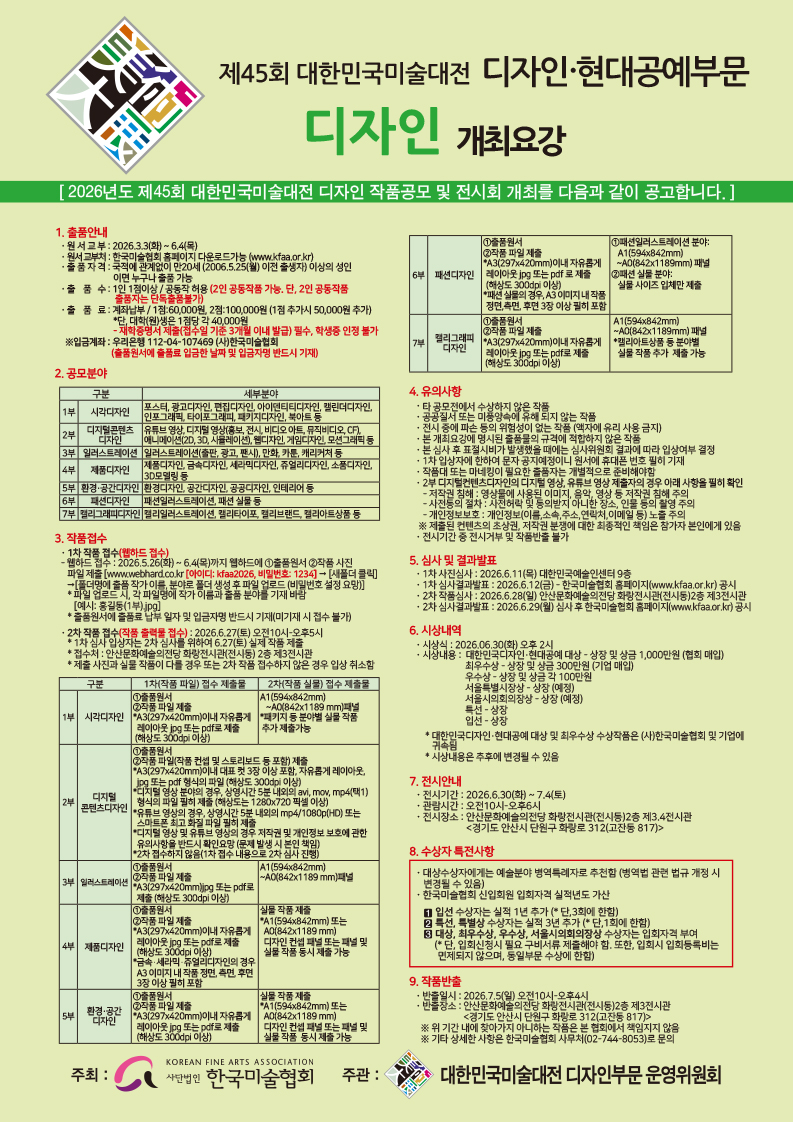 2026년 제45회 대한민국미술대전 <디자인> 개최요강 및 원서 공고입니다.