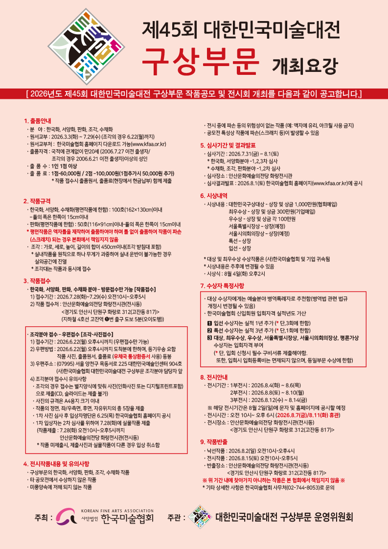 2026년 제45회 대한민국미술대전 <구상부문> 개최요강 및 원서 공고입니다.