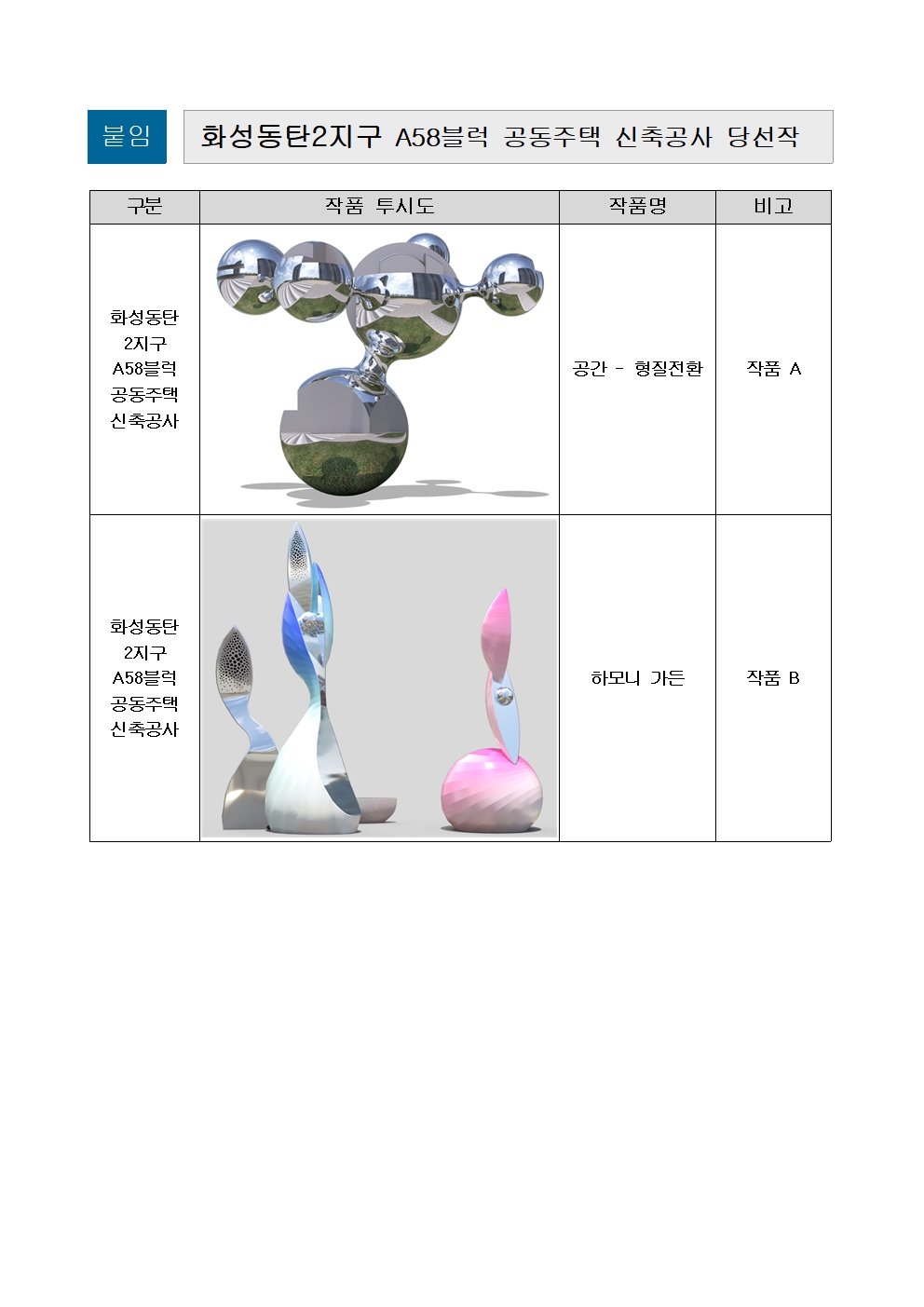 [화성동탄2지구 A58BL] 공동주택 미술장식품 선정작품 공고문