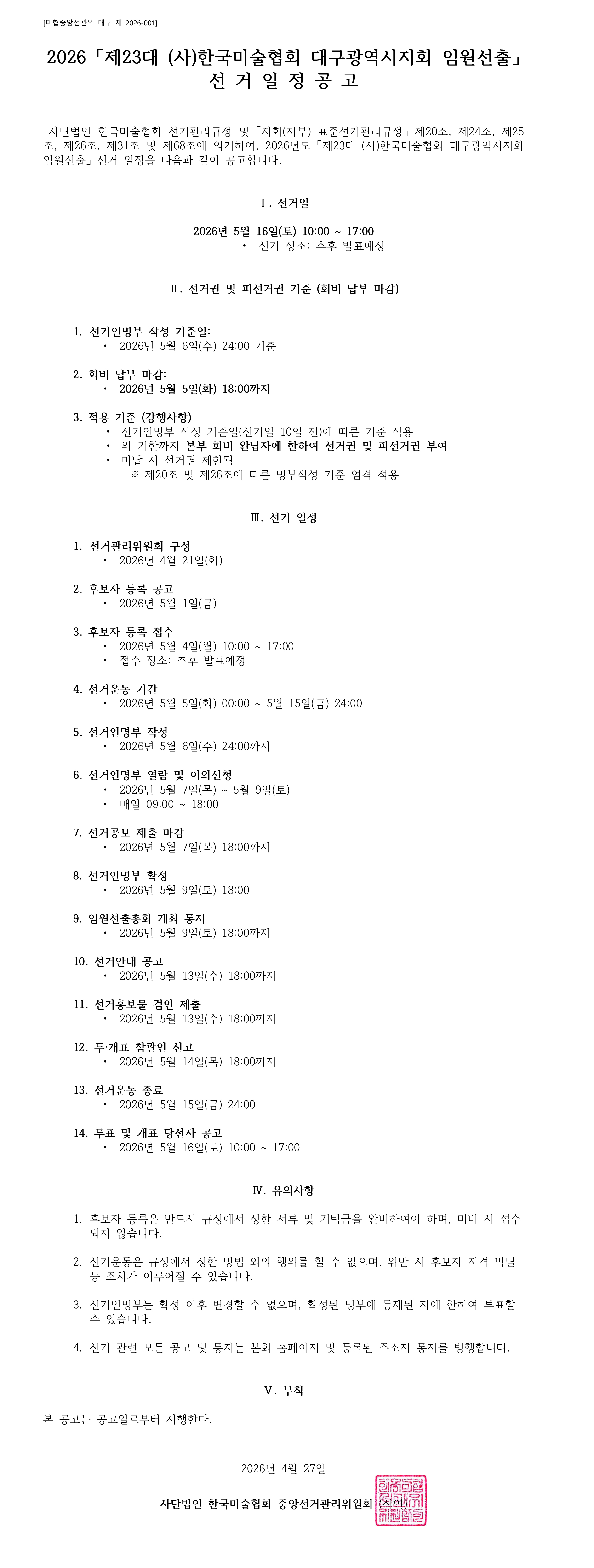 2026 제23대 (사)한국미술협회 대구광역시지회 임원선출 선거일정공고